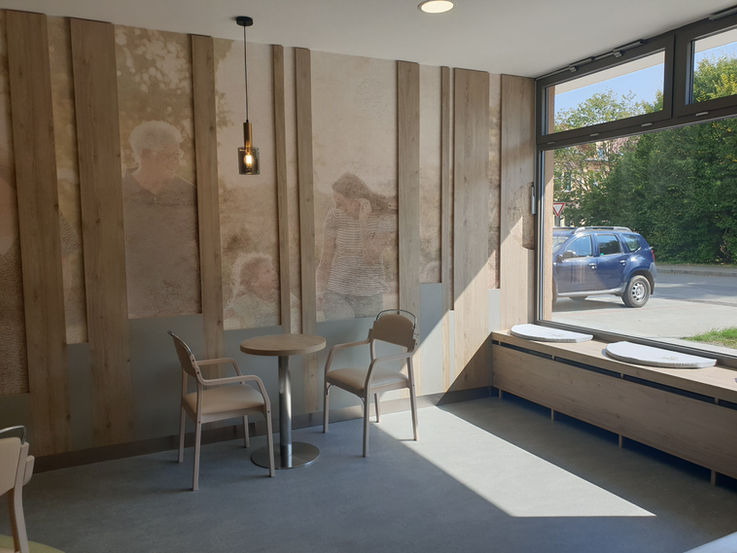 Velkou originalitou se stalo 9 odpočinkových boxů s knihovničkou pro odpočinek v dlouhých koridorech domova. Pro každý box byla navržena a vyrobena autorská květinová tapeta.